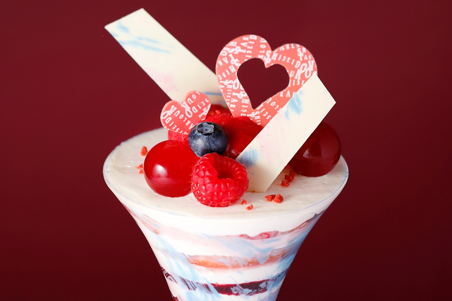 資生堂パーラー“濃厚ティラミス×ベリー”の24年バレンタイン限定パフェ、パステル色チョコを飾って