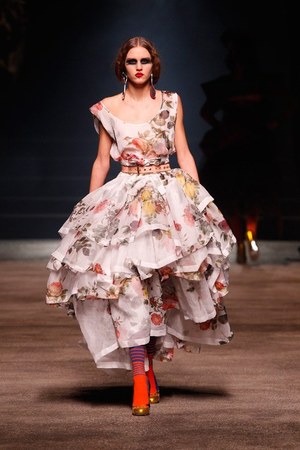 前作ではキャリーの結婚式の場面でヴィヴィアン・ウエストウッド(Vivienne Westwood)のウェディングドレスを着用したことで話題となったが、今回のジャパンプレミアでサラ・ジェシカ・パーカーが着用しているフラワープリントのドレスは、3月のパリコレクションで発表されたばかりの2010-11秋冬ヴィヴィアン・ウエストウッド ゴールドレーベル(Vivienne Westwood Gold Label)のドレス。