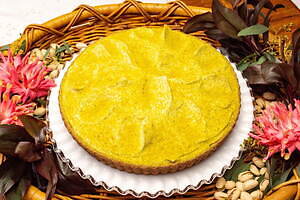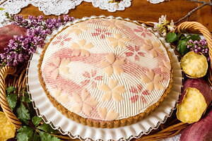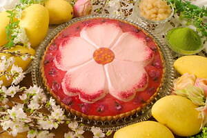「徳島県里浦産なると金時 “里むすめ”と胡麻のタルト」もまた、桜をモチーフにした一品。胡麻を加えたタルトに白ごまのクレームブリュレを入れて焼き上げ、さつまいものミルク煮をたっぷりとトッピング。仕上げに春の桜をイメージしたクリームを飾れば、春爛漫なタルトの完成だ。