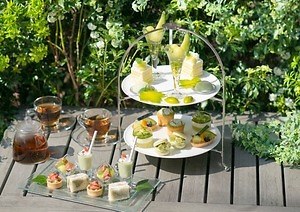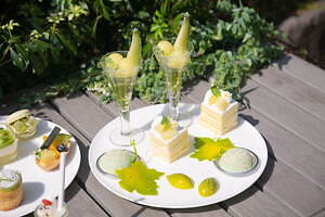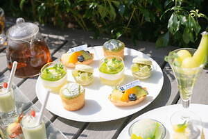 アフタヌーンティースタンドを彩るのは、1本の苗木から1つしか収穫できない希少な「千葉アクアメロン」を主役にしたスイーツやセイボリー。果実の甘みや瑞々しさを最大限に楽しめるショートケーキ、メロンの皮をイメージしたムース、ミントが爽やかに香る生ハムメロン、口いっぱいにメロンの甘味を感じるメロンヨーグルトスムージーなど、つややかな新緑の芽吹きを表現したメニューの数々が楽しめる。