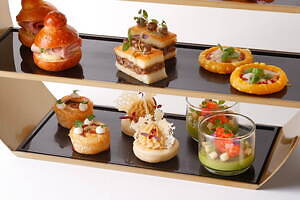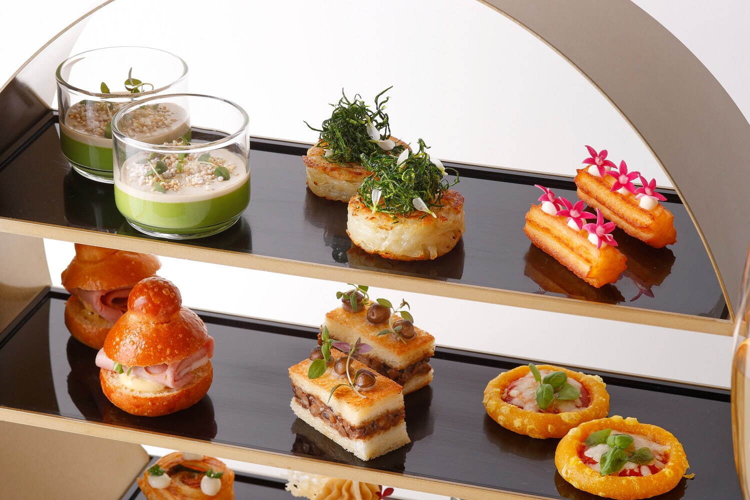 またキノコのサンドイッチには、マッシュルームをはじめ、ポルチーニ、あわび茸やシメジの香り豊かなソテーを、きのこのピューレにしてサンド。そのほか、イタリアの郷土料理をベースに、リストランテのエッセンスを加えた繊細な味わいのセイボリーが並ぶ。