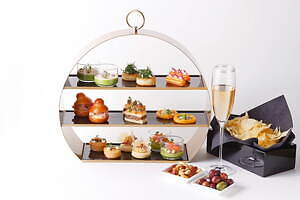 夕暮れを眺めながら楽しめる、アルマーニ / リストランテのアペリティーボボックス。完成度の高いセイボリーとともに、シャンパーニュやフランチャコルタなどをフリーフローで味わえる、スペシャル感が魅力のメニューだ。