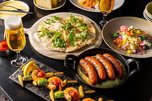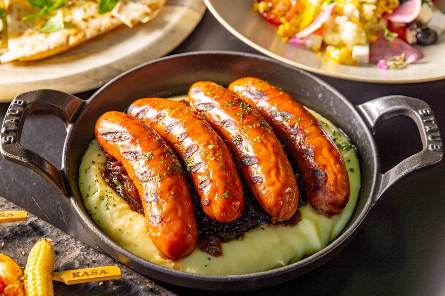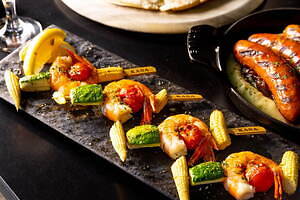 開放的なテラスに最適な料理は、ボリュームたっぷりの5品を提供。ニューカレドニア産天使海老を使ったギリシャ流の串焼き「スブラキ」、大迫力の極太ソーセージを味わう「バンガ―ズ&マッシュ」、イタリア産の米型ショートパスタを使った華やかなサラダなど、異国の夏を感じさせるメニューが楽しめる。