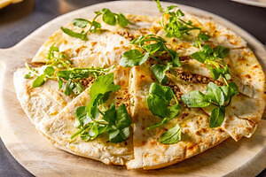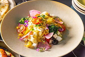 本日の前菜 / 温野菜とグリークフェタチーズのリゾーニサラダ / ニューカレドニア産天使海老のスブラキ / チキンケサディーヤ / バンガ―ズ&マッシュ