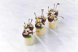 濃厚な甘さが特長のダークチェリーと食用花を、“籠”にいれたチーズケーキ「カジェット スリーズ」。中にはグラノーラを混ぜたクランチやアーモンドのジョコンドなどを入れて、ザクザクとした食感のアクセントをプラスしている。