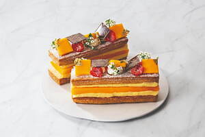 「マンゴーのミルフィーユ」は、フレッシュなマンゴーとマンゴーのリキュールで香りづけしたカスタードクリームを、730層にも折り上げたサクサクのパイ生地でサンドした。一口食べると、とろけるように濃厚なマンゴーと、バター香るパイ生地のハーモニーを楽しむことができる。
