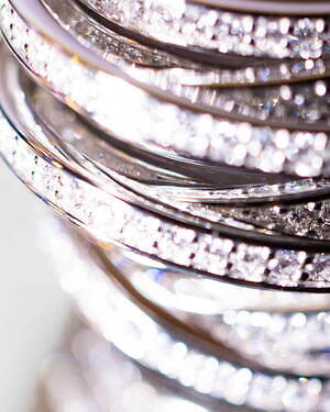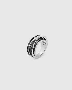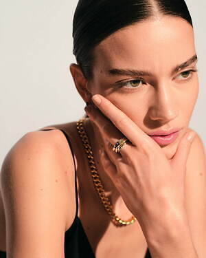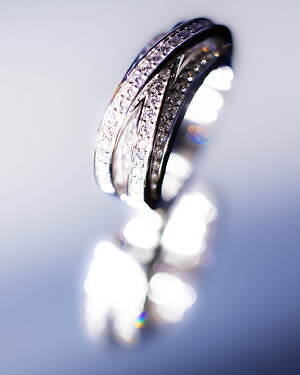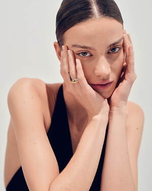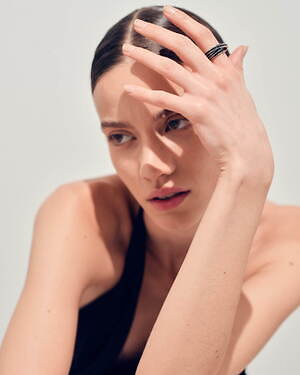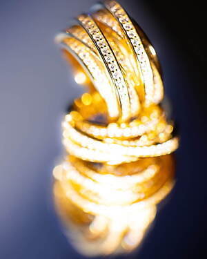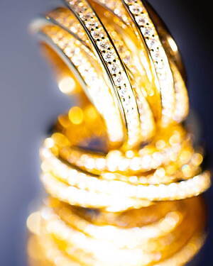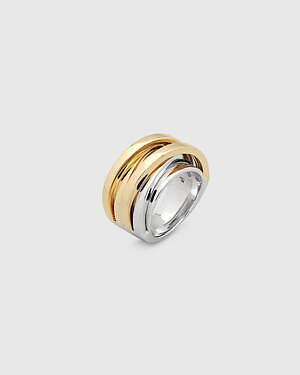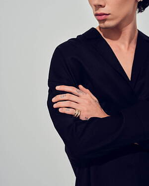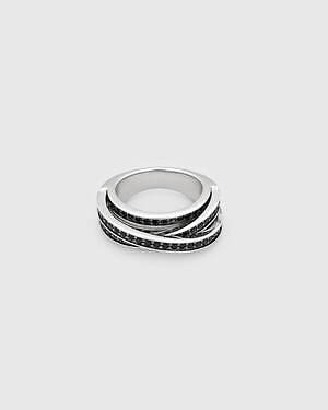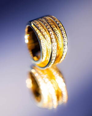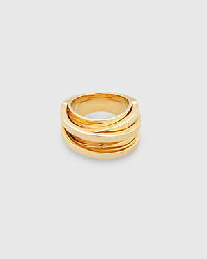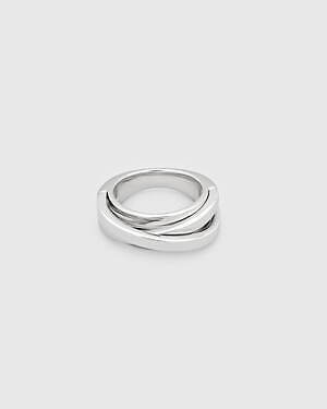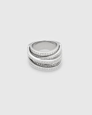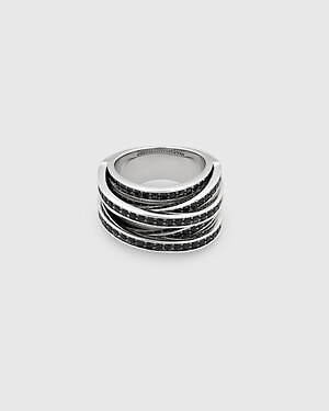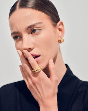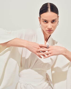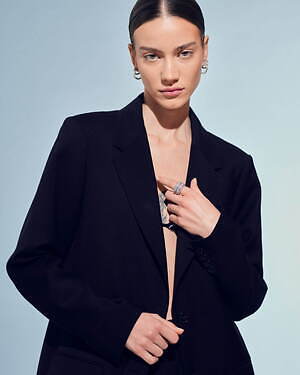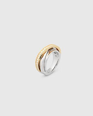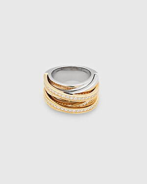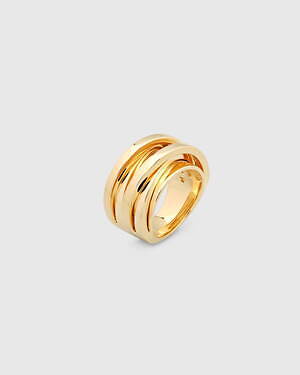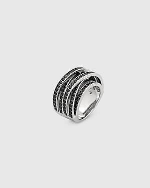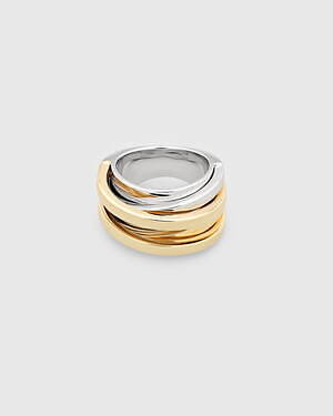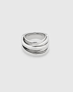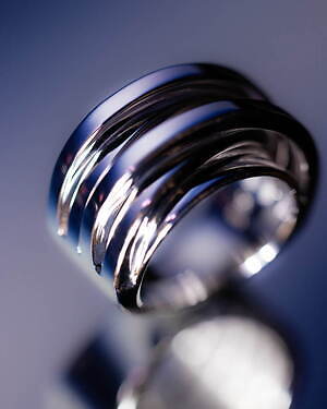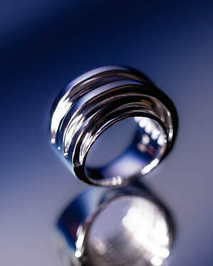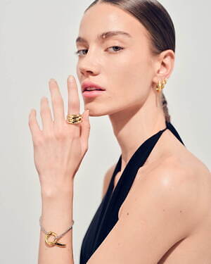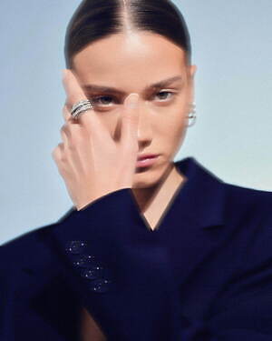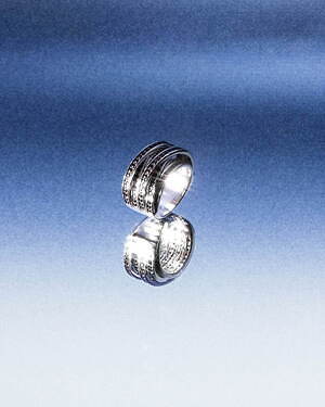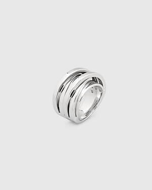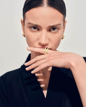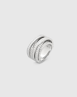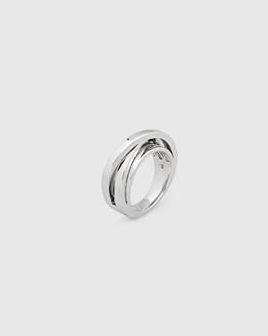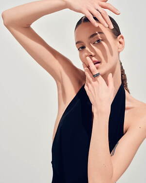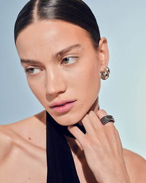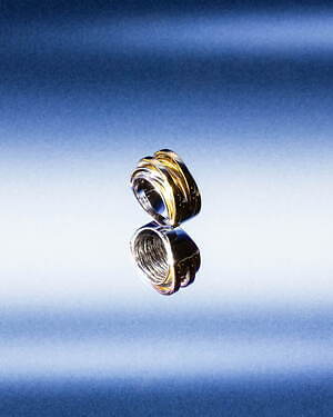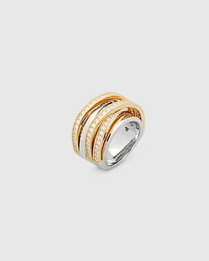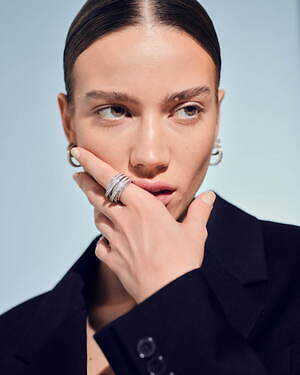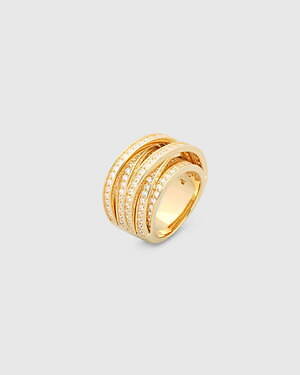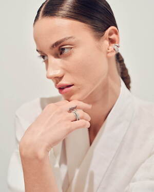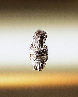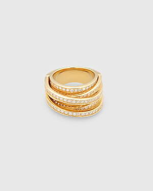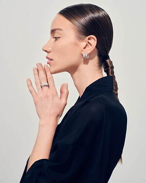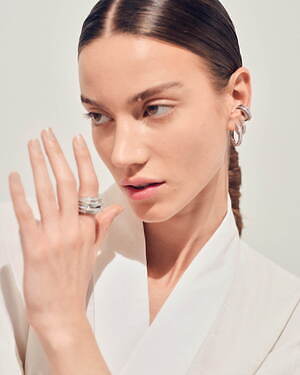 「オーブ コレクション」の中でも注目は、ベルナール・べネの作品を思わせる、幾何学的な曲線を重ねて構築されたリング。 正確な曲線によって表現された柔らかく渦巻く層と、それに沿うように配置された石によって、金属の質感を際立たせているのが特徴だ。