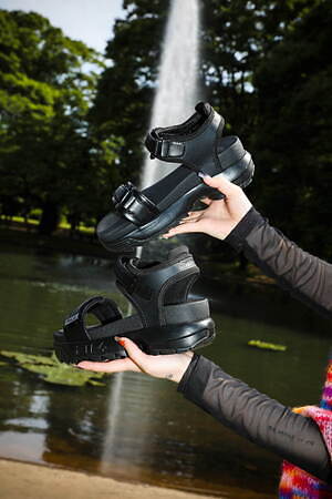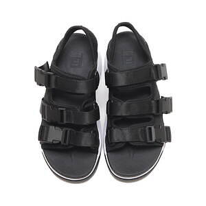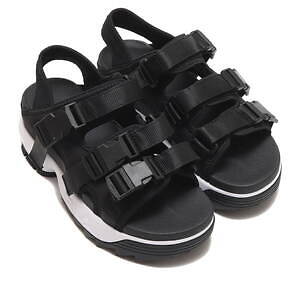 また、フィラを代表する「ディスラプター」をモデルにしたストラップサンダルも用意。全体をブラックカラーで統一することで、洗練された印象を演出する。素足ではもちろん、ソックスと合わせてもコーディネートを楽しむことができる1足となっている。