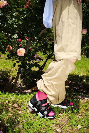 フィラの「ディスラプターSDパフィー」をベースにしたサンダルは、バックルを搭載することで存在感のある佇まいに。クッション性に優れたアウトソールや柔らかなミッドソールを採用して、快適な履き心地を実現している。かかと部分にあしらった、アトモスピンクのロゴもポイントだ。