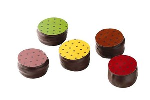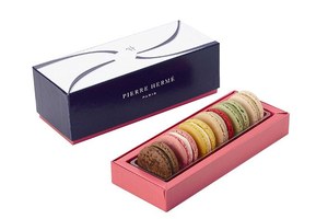 青木定治のパティスリー・サダハル・アオキ・パリからは、人気のマカロンにイタリア製「DOMORI」のショコラをコーティングした「ショコロン」の5個入りパッケージ。ポップでカラフルな色どりが贈り物にも最適だ。抹茶シフォンのケーキ「ドームさくら」は、鎧塚俊彦のヨロイヅカファーム・トーキョーより。桜餡を使うこと生まれる、和洋のテイストのミックスがおしゃれ。