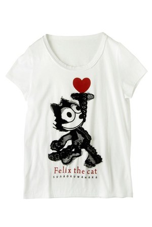 デザイナーである桑原直氏が、幼少時代アニメーションで見ていた「Felix the cat」。このキャラクターを自ら描きおろしてTシャツやバッグにプリントしたり、フィリックスのからだに、沢山のレースを貼りつけるなど随所にsunaokuwaharaらしさがみえ、sunaokuwaharaのオリジナリティと、お馴染みの「Feilix」からユーモア溢れる作品が誕生した。