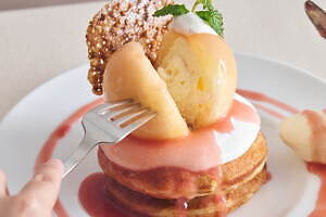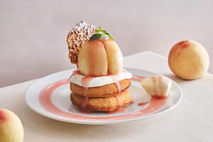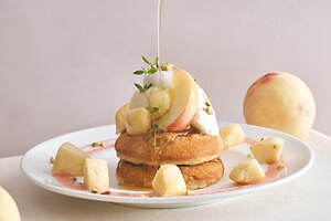中でも注目は、旬の桃が目を惹くパンケーキ「まるごと“岡山白桃”とミルキークリームのパンケーキ」だ。名前の通り、甘くてジューシーな「岡山白桃」を贅沢に丸ごと1個使用し、桃の中にはカスタードクリームをたっぷりイン。隠し味の練乳でコクが増した、口どけなめらかなミルキークリームと合わせた。