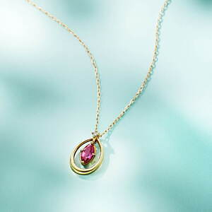 夏コレクションの注目は、7月の誕生石の深みあるルビーを施したジュエリー。しずくモチーフのネックレスは、地金を逆さにしてチェーンを通すことで、2way仕様で使うことができる。真夏の素肌に纏えば、赤色のルビーが鮮やかなアクセントを添えてくれること間違いなし。