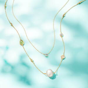 また、8月誕生石のペリドットを使用したネックレスは、リバーシブルにしても身につけられるのがポイント。首元のあいたシンプルな装いに、鮮やかなグリーンのペリドットの輝きをプラスすれば、カジュアルながらも洗練されたコーディネートが完成する。