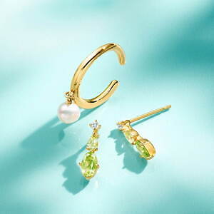 そのほか、イヤーカフとピアスのセットも登場。ピアスは、グリーンのペリドットやレモンクォーツを合わせて夏らしい爽やかな色合いに。耳元に揺れるバロックパールのイヤーカフを合わせることで、エレガントな印象を演出してくれる。