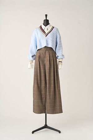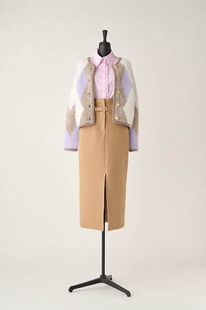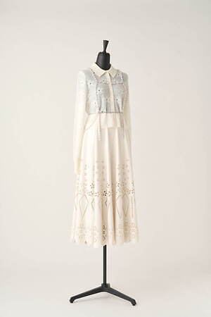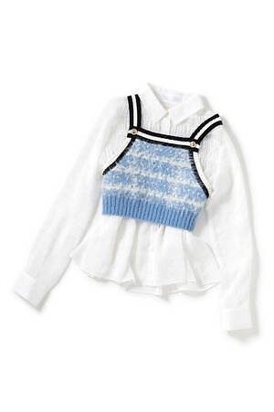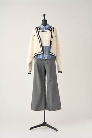 注目は、ニットの編地でミックスツイードを表現したビスチェ。シャツやシアートップスなど、様々なレイヤードスタイルを楽しむことができる。カラーは淡いくすみ色のサックスブルーのほか、あらゆるスタイリングに合わせやすいホワイト、ブラックがラインナップする。