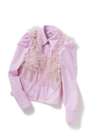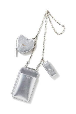 小物類もテーマに沿った可愛らしいアイテムがお目見えする。「トリプルポーチバッグ」は、メタリックなマテリアル×華奢なチェーンストラップがコーディネートにアクセントをプラスするバッグ。取り外し可能のスマホケース・リップケース・“ハート型”のマルチケースが配されており、その日の気分や用途に合わせて付け替えることができる。
