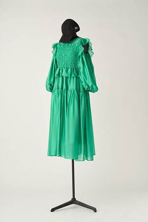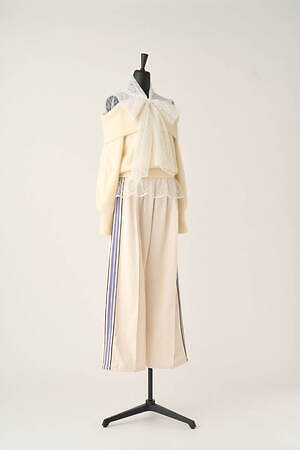ファーファーの2023年秋冬は“SWEET BOOSTER”がテーマ。ツイードをモードに昇華したニットベストや、繊細なチュールやレースを配したアイテム、メタリックに輝くバッグなど、異なるテイストを取り入れながらも“スウィートな魅力をブーストして自分らしく楽しむ”ようなウェア&小物が展開される。