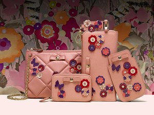 色とりどりの花に蝶が飛び交っているプリントが成された、春らしさ満載のキュートなトートバッグ。レザー製とナイロン製の2種類が用意され、ライニングはどちらもゼブラがモチーフとなっている。このモチーフは今回のコレクションの主役で、フェラガモの伝統的な柄を現代的に解釈したもの。