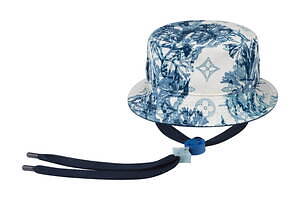 サンゴ礁から着想を得たブルーの模様が鮮やかな「バケットハット・LV プレイ」には、モノグラム・フラワー モチーフのビーズをあしらった2本のコードをプラス。コードは顎下で結んだり、後ろで結んだりと、様々なアレンジを楽しめる。