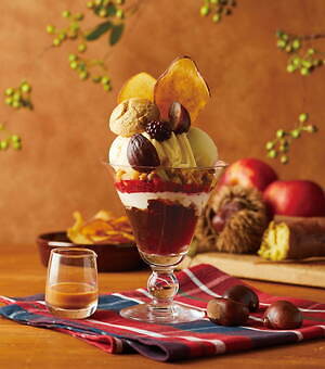 中でも特に注目したいのは、林檎とバニラのアイス、紅あずまのシロップ煮、りんごのチーズカスタードホイップ、紅茶ゼリーなど重ねた「さつまいもと林檎のモンブランパフェ」。トップにさつまいもクリームを絞り、仕上げにさつまいもチップスや渋皮栗をトッピングした、こっくりとした味わいのモンブラン風パフェだ。塩キャラメルのような味わいに仕立てた別添えのトフィーソースをかければ、より濃厚な味わいが楽しめる。