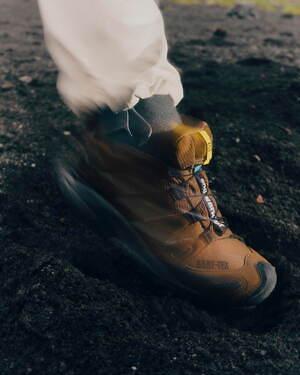 防水性に秀でたこのシューズを、サロモンとのコラボレーションでは、アンドワンダーのオリジナルカラーとなるブラウンでアレンジした。
