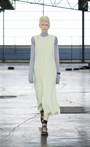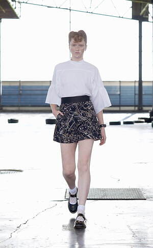 クロップド丈の長袖シャツに半袖シャツを羽織ったスタイリングなど、レイヤードスタイルが繰り返し提案されたのも印象的。シースルートップスに半袖のワンピースを重ねたルックでは、間に黒シャツを忍ばせることで更なる奥行きをプラスしていた。