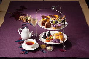 ヨックモック青山本店「ブルー ブリック ラウンジ」では、ハロウィン限定のアフタヌーンティーセットを展開する。2段重ねのティースタンドには、マロンにぶどうに梨、かぼちゃ、さつまいもなど、秋の味覚をふんだんに使用したケーキやグラスデザートを用意。魔女の帽子を模したさつまいものセイボリーなど、見た目にもハロウィンらしいラインナップとなっている。