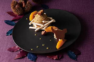 さらに「ブルー ブリック ラウンジ」には2種類の秋のデザートが登場。新作の「キャラメル ポワール」は、洋なしのムースを優しい味わいのキャラメルムースで包み、洋なしの果肉入りジュレで仕上げた爽やかな一品だ。栗そのものの魅力を最大限に引き出した「栗のデセール モンブラン」は、甘酸っぱいオレンジやほうじ茶アイスクリームつき。猫型チョコレートと共に味にアクセントを添えてくれる。