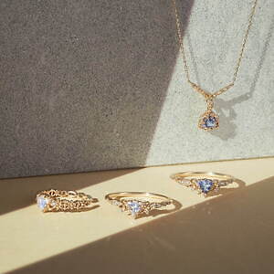 ノジェスの2023年冬コレクションの中でも注目は、ヨーロッパで古くから愛される菫の芳香に着目したジュエリー。菫色のタンザナイトを使用し、菫の清らかな香りが優しく広がる様子を表現した。繊細な透かし細工でプリンセスカットのタンザナイトを囲み、リングやネックレス、ピアスにさりげなくダイヤモンドを添えている。