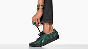 厚みのあるブラックのソールにアーカイブグリーンのアッパーが特徴の「プーマ スエード スニーカー」の表面には、美しいクリスタルが散りばめられている。歩くたびに光を受けて煌めくようにデザインされたスニーカーは、足元から気分を盛り上げてくれそうだ。インソールにはプーマ75周年を記念するロゴもあしらわれている。