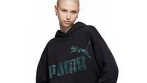 「プーマ フーディー」はリラックスしたオーバーサイズのカットで、気取らないストリートウェアのカジュアルな雰囲気を演出した。硬質なブラックの生地が、プーマのロゴをかたどった多面的なスワロフスキーの輝きをより一層引き立てている。