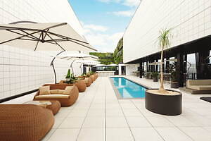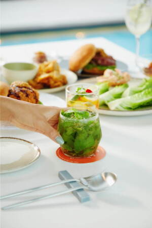 ホワイトを基調とした、ワンランク上のラグジュアリーな空間を楽しめる「ザ ラウンジ」は、開放感あるオープンエアーが魅力的だ。夜になるとミクソロジーカクテルやモクテルなど本格的なバーを楽しめ、大人の隠れ家のような落ち着いた雰囲気を演出する。