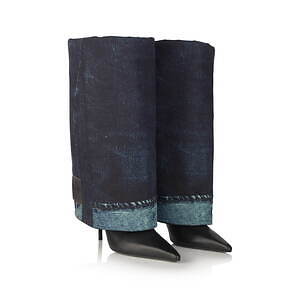 ニーハイブーツは、2WAY仕様のユニークなシューズ。そのまま着用すればレザーのニーハイブーツとして、履口を折り返してデニムプリントを表に見せればミッドカーフブーツとして楽しめる。