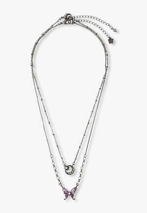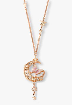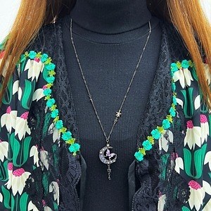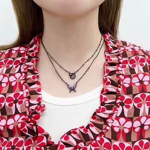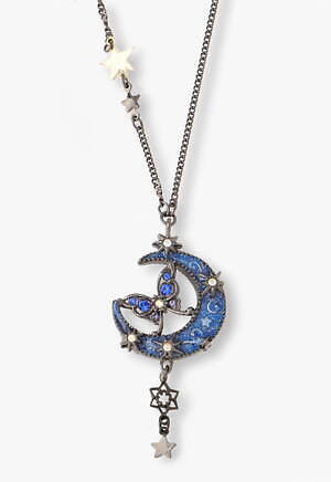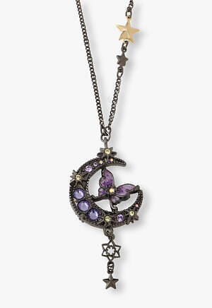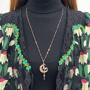 永遠の美しさや不老不死を象徴する三日月が大胆にあしらわれたネックレスは、カットガラスと独特な色味を醸し出すエポキシカラーでさらに魅力的な装いに。またトップ部分はリバーシブル仕様となっており、裏返して使用することで深みのあるパープルやブルーカラーの三日月が異なった雰囲気を演出してくれる。チェーンなど細部にまで散りばめられた星々の装飾が繊細で華やかなアクセサリーだ。