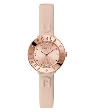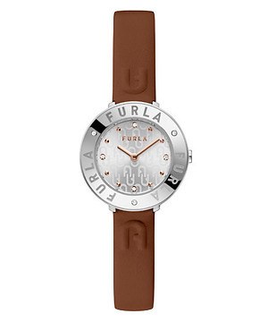 新作では、エレガントな光沢感のあるサンレイ仕上げを施した文字盤の12時、3時、6時、9時位置のインデックスに、光を受けて輝くヨーロッパ産のクリスタルを配置。またステッチのないミニマムなデザインが特徴のレザーストラップには、デボス加工で立体感のあるフルラアーチのロゴをあしらい、上品なムードにさりげないアクセントを加えている。