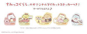 「すみっコぐらし」コラボレーションメニューとして、「シロノワール いちごのミルフィーユ」、「つぶつぶいちごミルク」がラインナップ。いずれも1つ注文するごとに、キラキラのオーロラ加工を施したすみっコぐらしオリジナルダイカットステッカーが付いてくる。