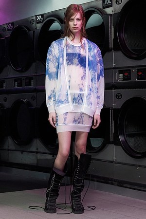 それから多くのアイテムで見られるタイダイ柄も、コレクションを語る上で欠かせない要素の1つ。サイケデリックやボヘミアンといったカルチャーとも密接に関わりのあるタイダイ柄だが、アレキサンダー ワンの手にかかったことで、その特有の鮮やかさ、激しさは幾分抑えられ、まるで大理石のような静謐さすら感じられる。また柄自体は同じながら、ラムスキンには手染め、セロファンニットには機械織り、またシルクやウォータープルーフのナイロンにはデジタルプリントと、素材によって表現の手法を変えることで新たな風合いを追求。タイダイPVCのレインコートは、イタリアのフラミス社の熱圧着の技術をシームに使用することで、シームレスかつウォータープルーフに仕上げた力作だ。