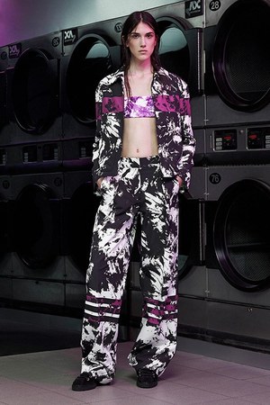 今回のテーマとなったのは「安全標識」「警戒標識」「取り扱い表示」。すべて建設現場で使用されている標識だ。ここからインスピレーションを受けたウェアには、リフレクター素材など工業的なアクセントが目立つほか、多数のポケットやワイドなシルエットといった、ワークウェア特有の要素が存分に発揮されている。例えば、モノクロのカーゴジャケットやドレス、ロンパース、オーバーサイズのカーゴパンツなどがそうだ。