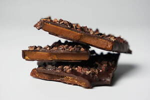 「ニブトフィーチョコレート」は、サクサクのバターキャラメルを、トロピカルフルーツのようにすっきりと個性的なフレーバーが特徴の、ドミニカ共和国産カカオ70%チョコレートで包み込んだ1品。カカオニブだけでなく、岩塩のトッピングを加えることで、ほどよい塩味がカカオのフレーバーを引き立てる。