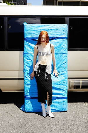 春夏シーズンにぴったりの、軽快なニットアイテムに注目。南国のフルーツを思わせる“トゲトゲ”フォルムが特徴的なアイコンニット「ドリアン(Durian)」から、透け感のある素材を用いたノースリーブトップスがラインナップする。シアーな質感と明るい色彩が織りなす、爽やかなムードが魅力だ。カラーは、ホワイト、ブルー、ライムの3色を展開する。