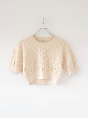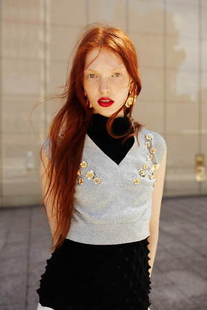 コーディネートのアクセントに取り入れるなら、ラメニットがおすすめ。コンパクトなクロップド丈のニットベストには、メタルのフラワービーズ刺繍を手作業で施し華やかに仕上げた。ラメ糸ながらふわふわとしたソフトな肌触りなのも嬉しいポイントだ。