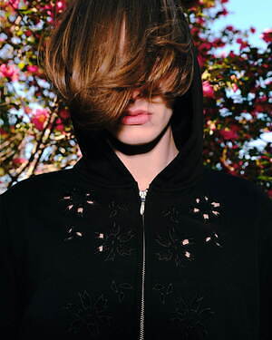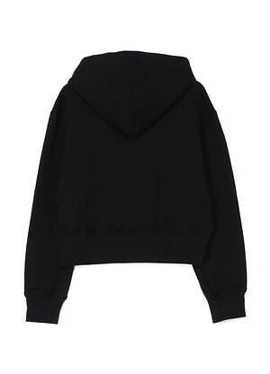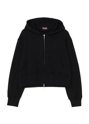 ジップアップフーディ―のデザインは、ヨウジヤマモト プールオム 1996春夏コレクションにて発表された繊細な花のカットワーク加工がメイン。ボディは、何度も染めることでまるで漆黒の様な深い「黒」に仕上げた裏毛だ。M A S Uのシグネチャーでもある、ショート丈フーディのパターンに落とし込み、ミニマルな見た目に仕立てている。