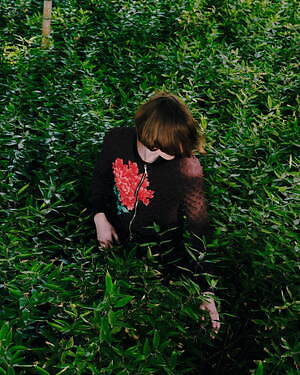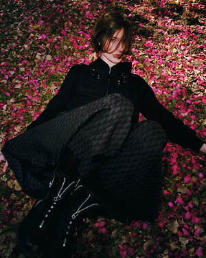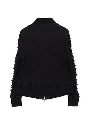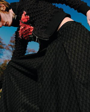 ジャケットは、牡丹の花を描いたヨウジヤマモト プールオムのアイテムをベースに、伸縮性のあるポップコーン加工を施した、M A S Uを象徴するスパイキーブルゾンへと再構築。黒の中で鮮やかな花が浮かび上がるように配された、インパクトのあるビジュアルが特徴だ。