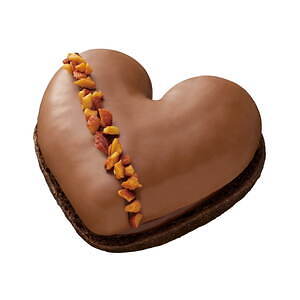 もう一方の「ハートショコラ レ」は、生チョコレートとガナッシュが織りなすチョコレートの味わいを贅沢に楽しめるドーナツだ。プレミアムハートココア生地にビターガナッシュとプラリネホイップ、生チョコレートをサンドし、仕上げにミルクチョコレートをかけて、キャンディングアーモンドをアシンメトリーに並べている。