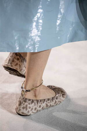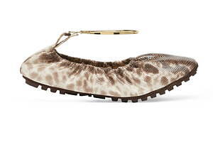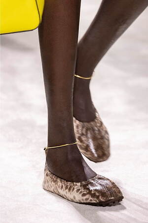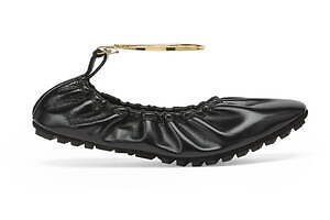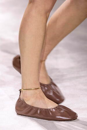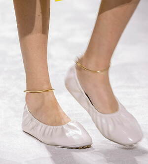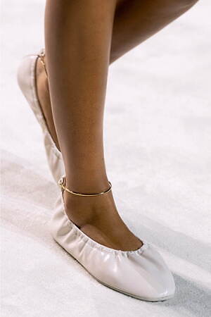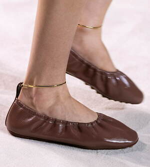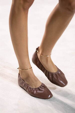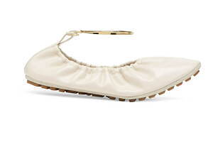 「フェンディ フィーロ」は、熟練の職人たちが手作業でゴムを通し、ギャザーを調整しながら仕上げたアッパーとラウンドトゥが特徴のバレリーナシューズ。足首には、メタリックゴールドのアンクレットを添えて、やわらかな質感のバレリーナシューズにアクセントをプラスしている。