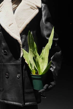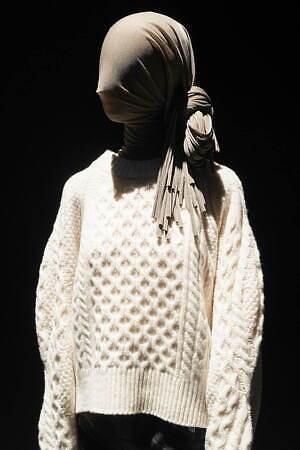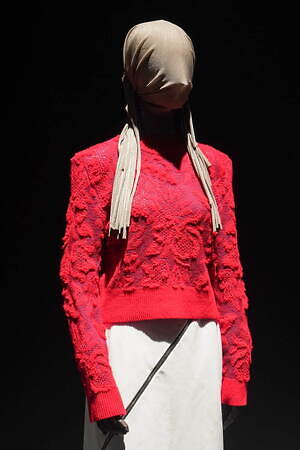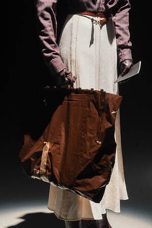 また、ヴィンテージ花柄をゴブラン織で施したトップスを着た、毎週水曜日カフェにいるエミリアや、膝にポケットが付いたワークパンツを履く美容師のビルギッタなど、ルックから彼女たちの情景が思い浮かぶ。このような広く大衆的な衣服をインスピレーション源に、ハイエンドな素材を用い、絶妙なバランス感のあるルックを作り上げているのが特徴だ。