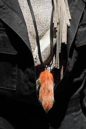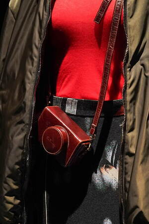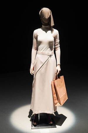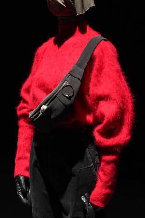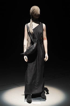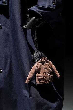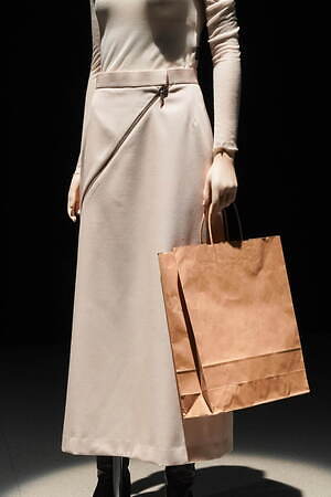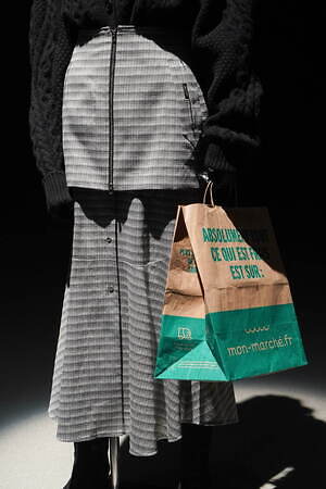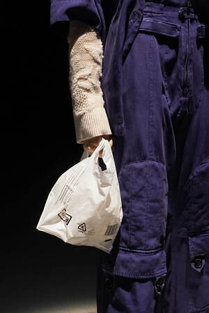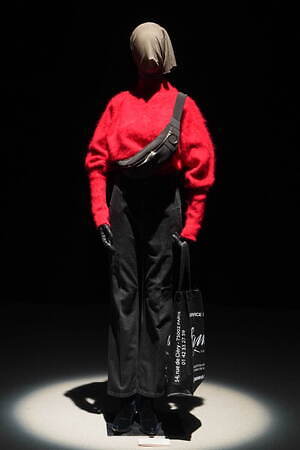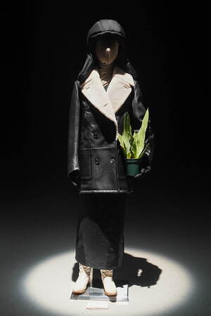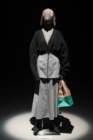 生活感のある小物も見逃せない。マネキンたちは、仕事用のトートバッグからカメラ型のショルダー、ワークジャケットのチャームが目を惹くポーチ、買い物の紙袋、カフェでもらったビニール袋まで、暮らしに根付いたアクセサリーを身に着けており、その実在するであろう人物をより身近に感じとることができた。