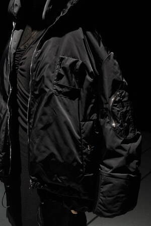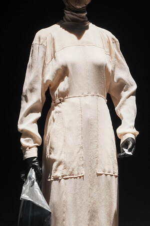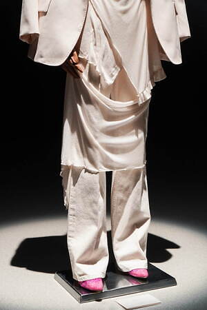 竹内が目指したのは、日々の営みで見過ごされてしまったものの可視化。たとえば、ライトベージュのシンプルなセットアップには、透け感のある生地をスカートのように巻き付けたり、腰部分に“まるで枕”のようなフリル付きの布を垂らしている。