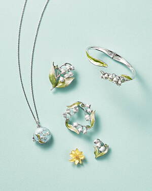 このほかにも、春らしく上品な“すずらん”アクセサリーが勢ぞろい。すずらんのぷっくりとした花やしなやかな葉の形を落とし込んだブレスレットやブローチなども展開される。
